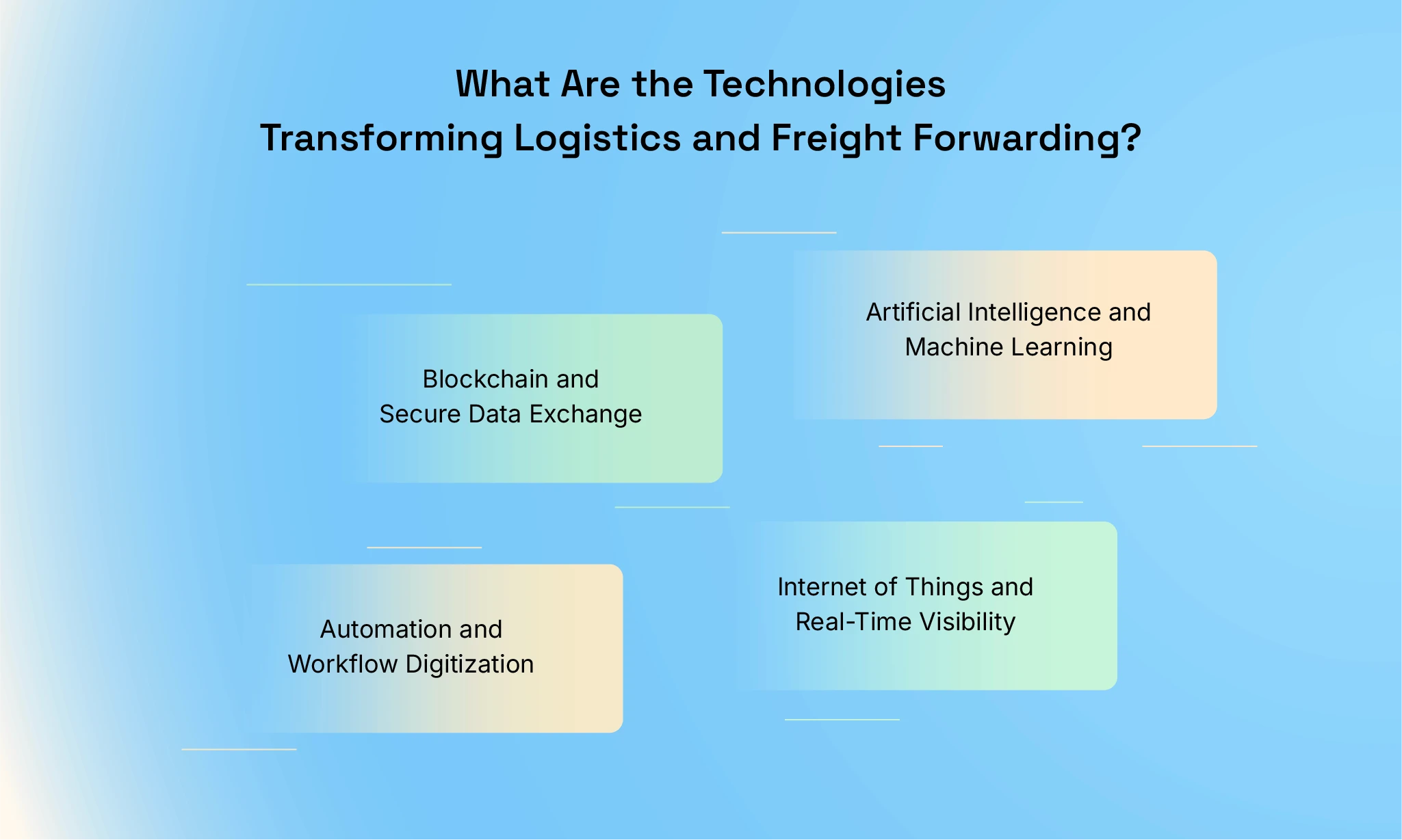 As freight forwarding continues to evolve, several core technologies are driving this transformation. Each plays a distinct role in improving efficiency, visibility, and control across the supply chain.