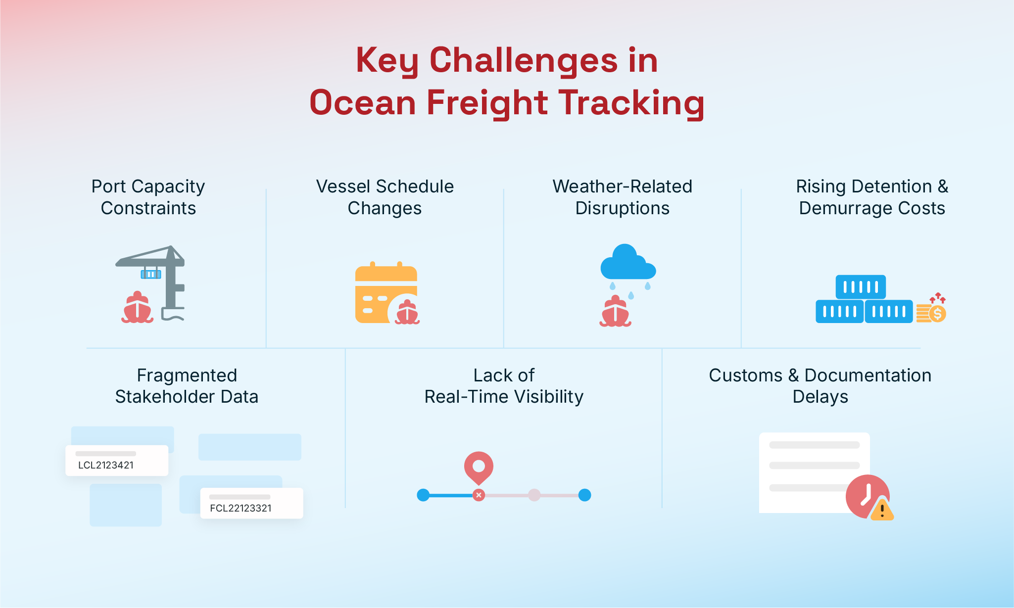 Ocean freight tracking faces several challenges due to frequent disruptions such as port congestion, vessel schedule changes, and weather-related delays. At the same time, shipment data must be coordinated across multiple stakeholders, including ocean carriers, port operators, freight forwarders, and customs brokers. This fragmentation makes it difficult to maintain consistent visibility and timely decision-making across the supply chain.